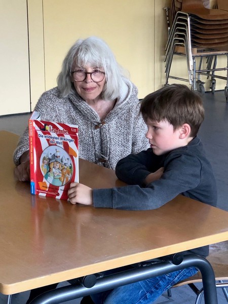 Schüler den Seniorinnen, Senioren und ihren Betreuerinnen in der Aula der Schule vorlesen, während die Klasse im Klassenzimmer las.