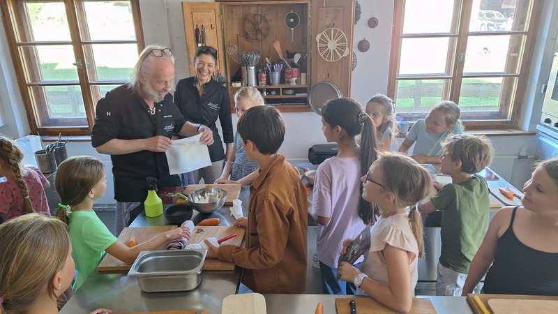 Auf ging`s für die Klasse 3a der Grundschule Samerberg gleich am frühen Morgen gut gelaunt Richtung Grainbach. Kochen stand auf dem Stundenplan. Zusammen mit dem Klassenlehrer, einigen engagierten Eltern und natürlich unter der fachkundigen Anleitung von Véronique Witzigmann und Volker Debus wurde fleißig Gemüse gewaschen, geschält und geschnippelt. Die Kinder freuten sich sichtlich, gemeinsam kochen zu dürfen und neue Techniken sowie Rezepte kennenzulernen."Ich kann schon ein paar Rezepte, aber das heute ist noch mal etwas anderes. Deswegen finde ich die Aktion sehr gut", erzählte der 9-jährige Jasper. Am Ende wurde dann eine leckere Pasta sowie eine schmackhafte Nachspeise gezaubert. Geschmeckt hat es auf jeden Fall und einige wollten es gleich zuhause nachkochen.