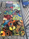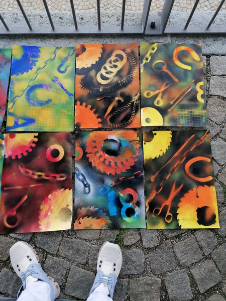 Dann ging es an die kreative Arbeit: Zuerst gestalteten die Schülerinnen und Schüler großflächig einen Hintergrund – je nach Wunsch einfarbig oder in mehreren Farbtönen. Nach einer kurzen Trocknungszeit erhielten die Kinder zunächst eine kurze Einführung in die Technik des Sprayens, bei der auch auf Sicherheit und den sorgfältigen Umgang mit Farben und Materialien geachtet wurde. Dann begann der spannendste Teil: Mit Hilfe von Werkzeugen oder anderen Gegenständen wie Blättern, Schablonen oder Alltagsmaterialien wurden besondere Effekte und Muster auf die bunten Flächen gesprayt. So entstanden beeindruckende Kunstwerke, jedes einzigartig und Ausdruck der Fantasie der Kinder.