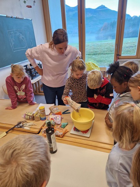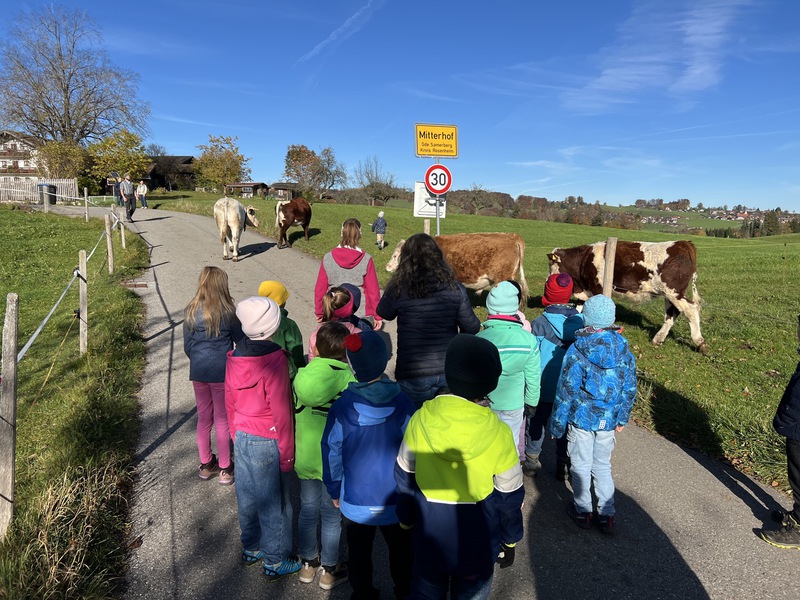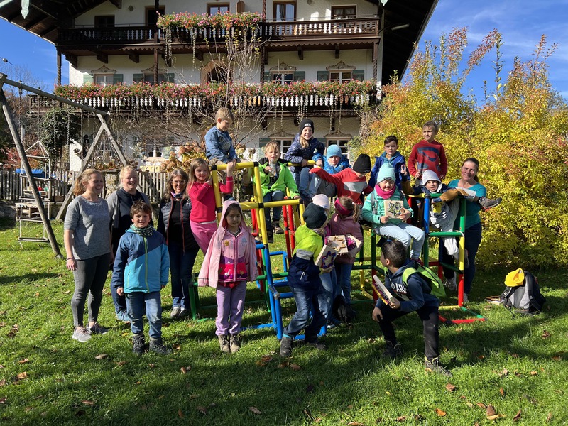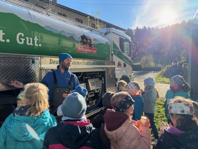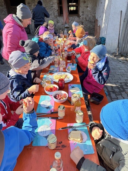 An unserem Wandertag am 29.11. machten wir uns bei sonnigem Herbstwetter auf den Weg zum Bauernhof der Familie Wörndl in Ried. Dort wurden wir von Familie Wörndl und zwei Helferinnen des Alltagskompetenzteams herzlich begrüßt und bekamen einen Einblick in die Arbeit auf dem Bauernhof. Wir durften den Stall anschauen und beim Füttern der Kühe zusehen. Mit Herrn Wörndl wogen wir auf einer Waage ab, wie viel Silo eine Kuh am Tag frisst und Frau Wörndl erklärte uns ausführlich, wie der Melkroboter funktioniert. Der Milchlaster kam und wir durften auch dem Milchfahrer noch Fragen stellen. Wir schüttelten aus Sahne unsere eigene Butter und konnten diese bei einer herrlichen Brotzeit am Hof probieren. Außerdem wurden wir mit frischen Eiern von den Hühnern am Hof, selbstgemachter Marmelade und eigenem Honig nebenan verwöhnt. Wir haben von der Firma ORO Apfelsaftflascherl spendiert bekommen und von der Molkerei Berchtesgadener Land Brotzeitbretterl für die Kinder.