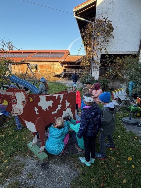 Anschließend durften wir uns noch auf dem Spielplatz austoben, Kälber streicheln und uns im Melken an einem Kuhmodel versuchen. Nach einem sehr interessanten und vielseitigen Vormittag wanderten wir wieder zurück.