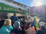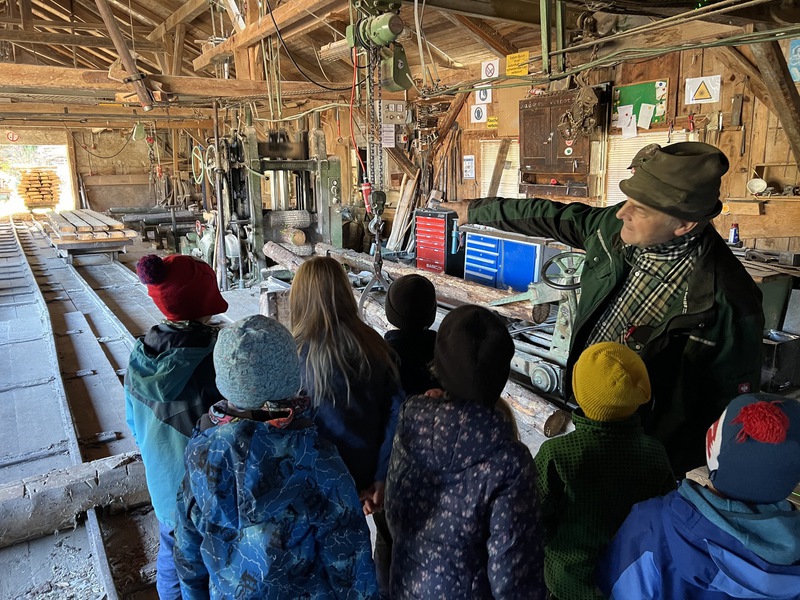 Im Sägewerk angekommen wurden uns die einzelnen Arbeitsschritte bei der Holzverarbeitung gezeigt. Gespannt beobachteten die Kinder wie die einzelnen Holzstämme mit einem Laser und einer Säge zu Brettern geschnitten wurden.